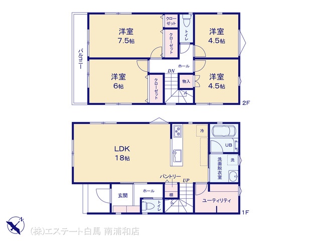 | 間取 | 4LDK+ユーティリティルーム (LDK18帖、洋室7.5帖、洋室6帖、洋室4.5帖、洋室4.5帖) | ||