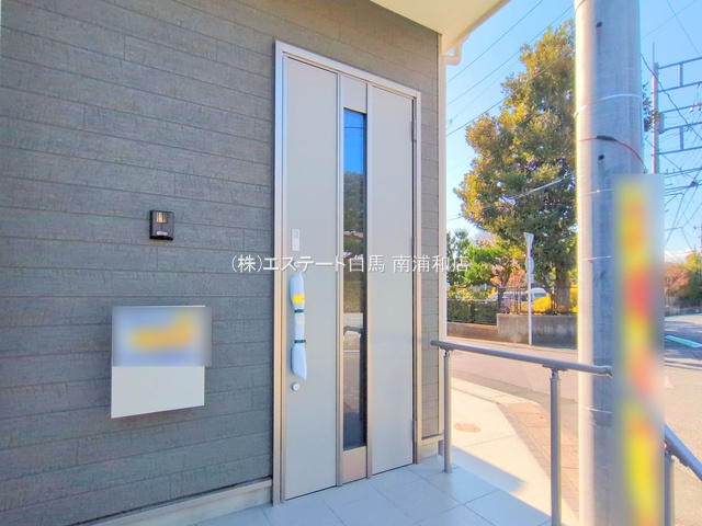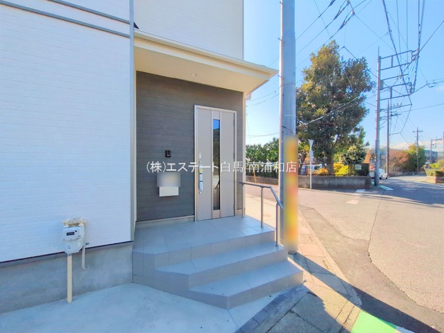 ポーチのついた新築分譲物件。玄関の印象はいかがでしょうか?入口からご覧ください。