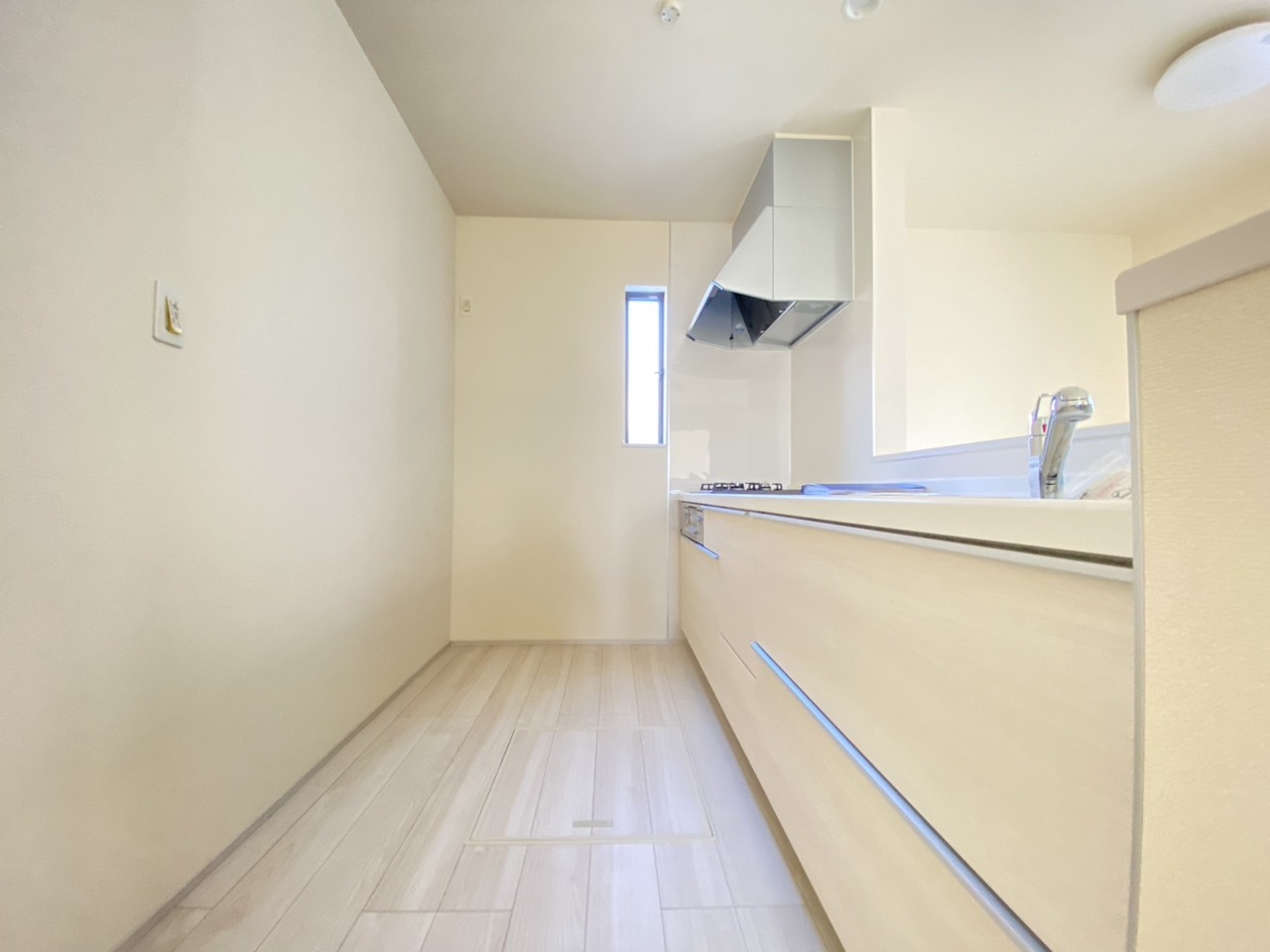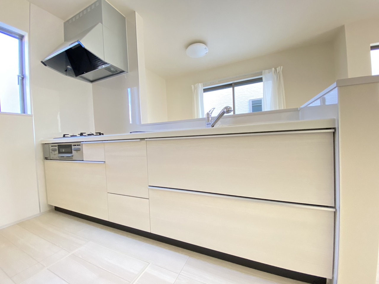 スライド収納付きシステムキッチン。お鍋類の出し入れもスムーズ。
