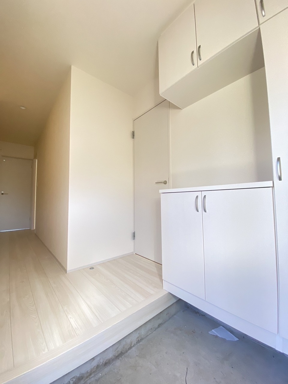 誰も住んだことのない家の玄関スペース。あたらしい木のにおいを感じていただけると思います。