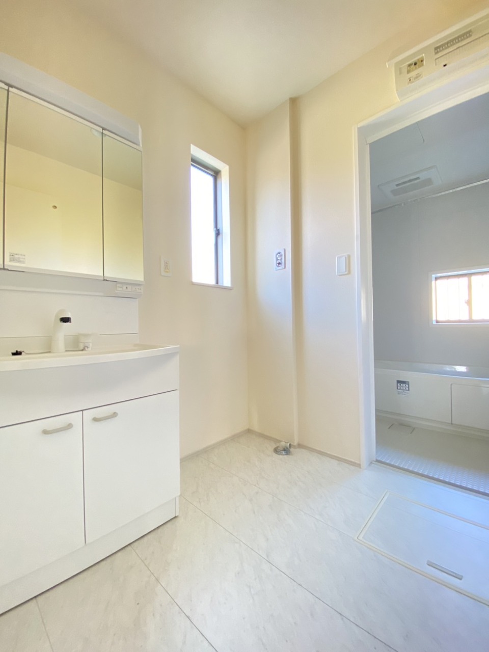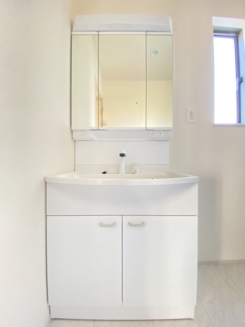 洗面化粧台は清潔感の漂うホワイトをベースカラーに、シンプルなデザインで。