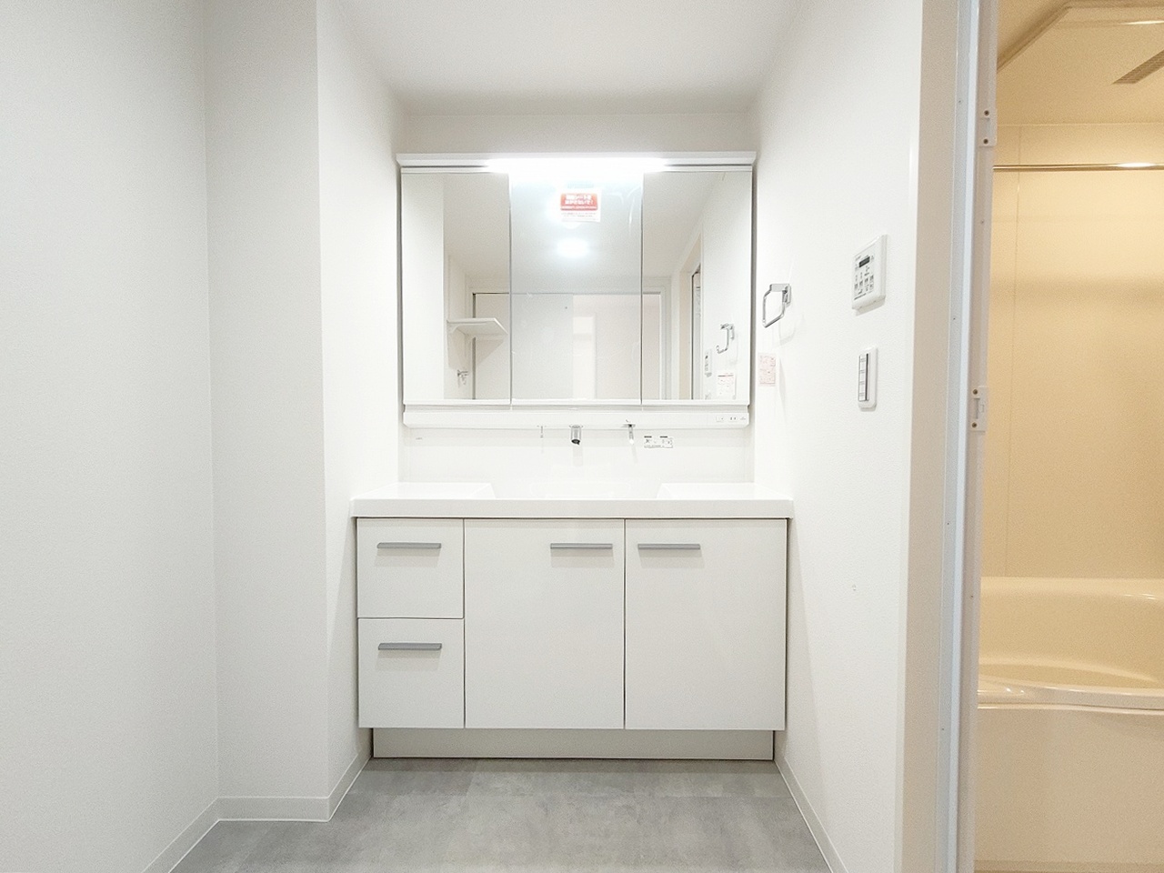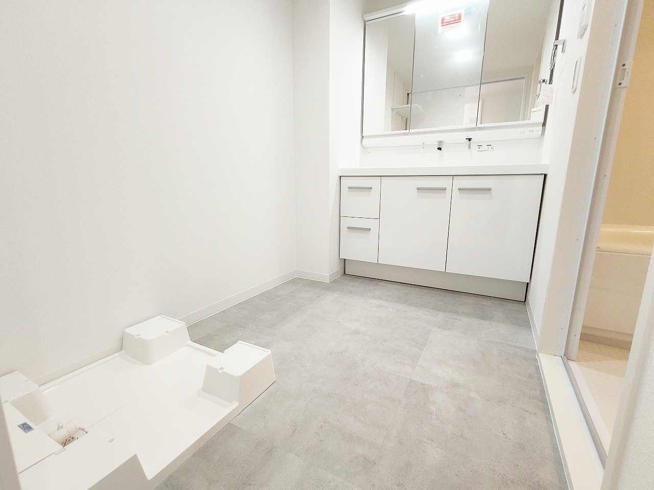 洗面化粧台は清潔感の漂うホワイトをベースカラーに、シンプルなデザインで。