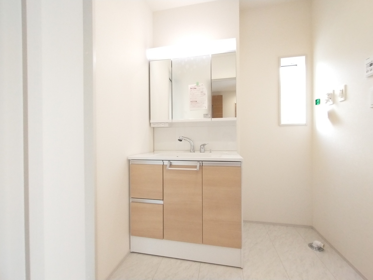 洗面化粧台は清潔感の漂うホワイトをベースカラーに、シンプルなデザインで。