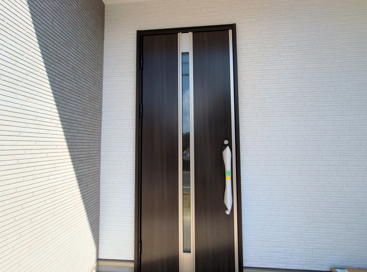 ポーチのついた新築分譲物件。玄関の印象はいかがでしょうか?入口からご覧ください。