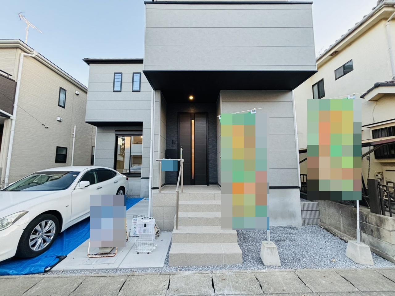 ポーチのついた新築分譲物件。玄関の印象はいかがでしょうか?入口からご覧ください。