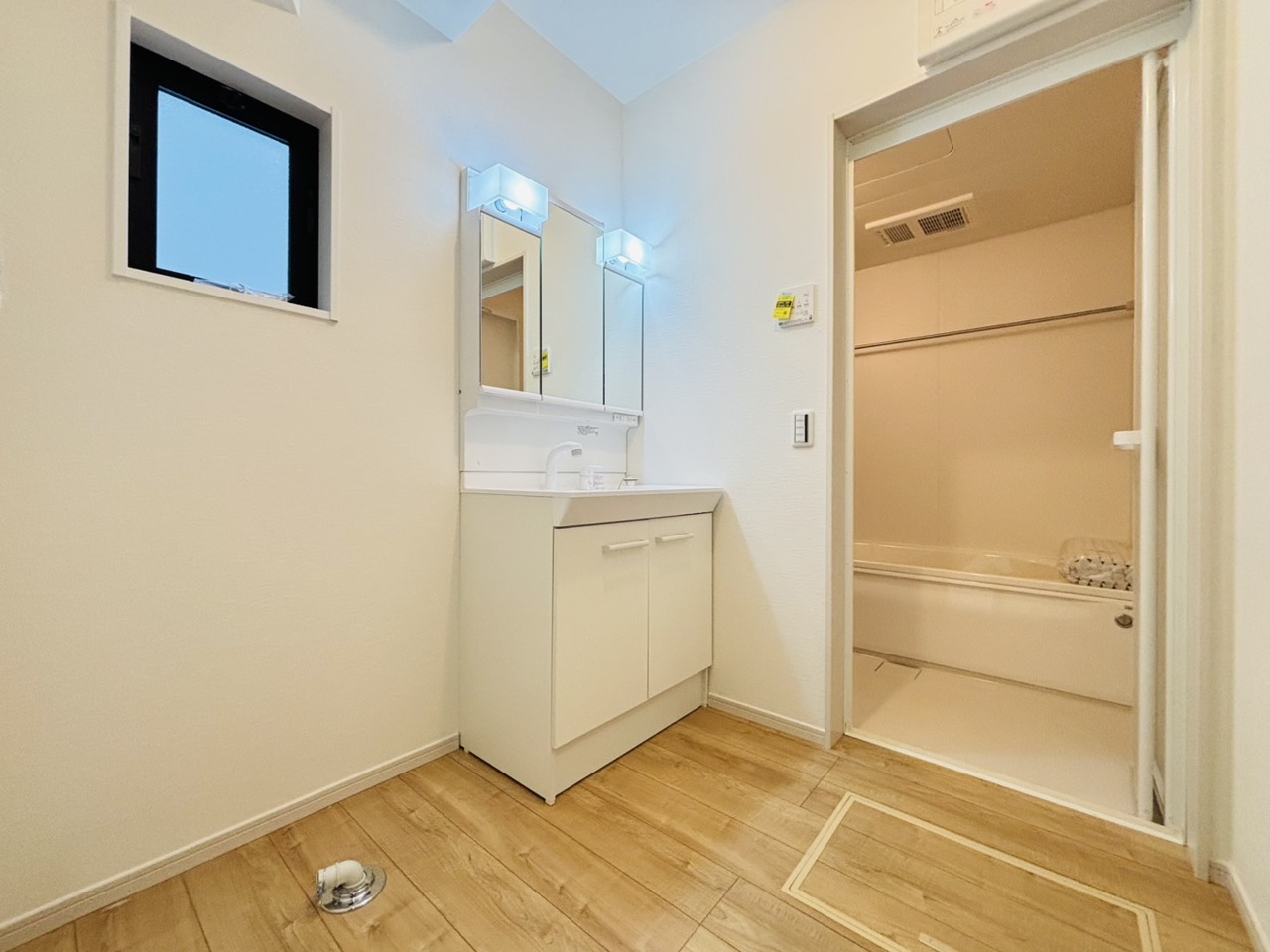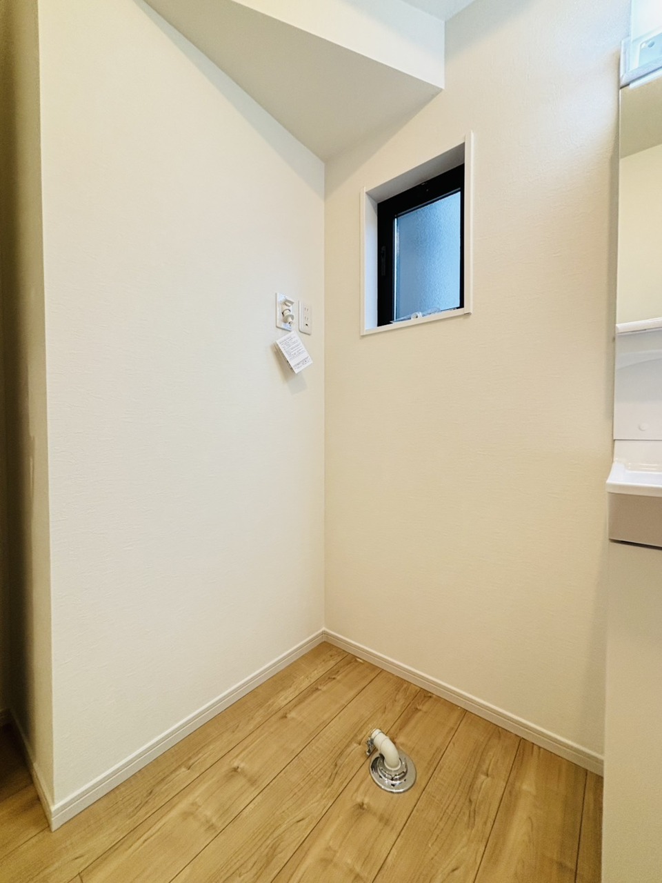 洗面台横にランドリーコーナーもゆったり。ドラム式洗濯機も置けそう。