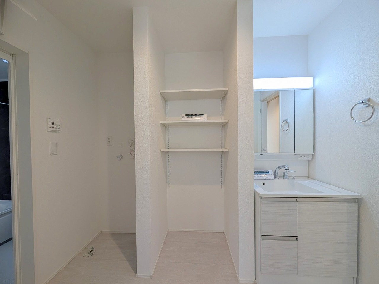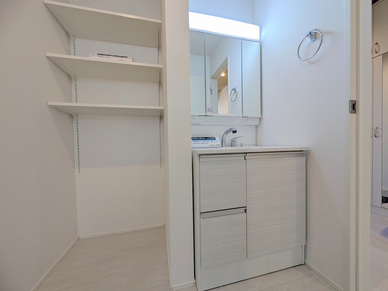 三面鏡を採用した洗面化粧台。鏡の裏にも収納スペースがあります。