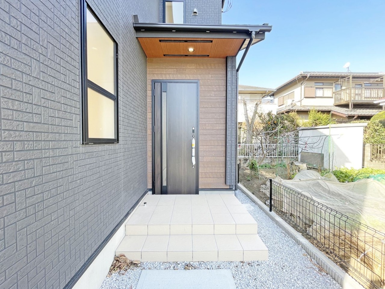 アプローチからの玄関がおしゃれな住宅。出発も帰宅も楽しみになるかも。