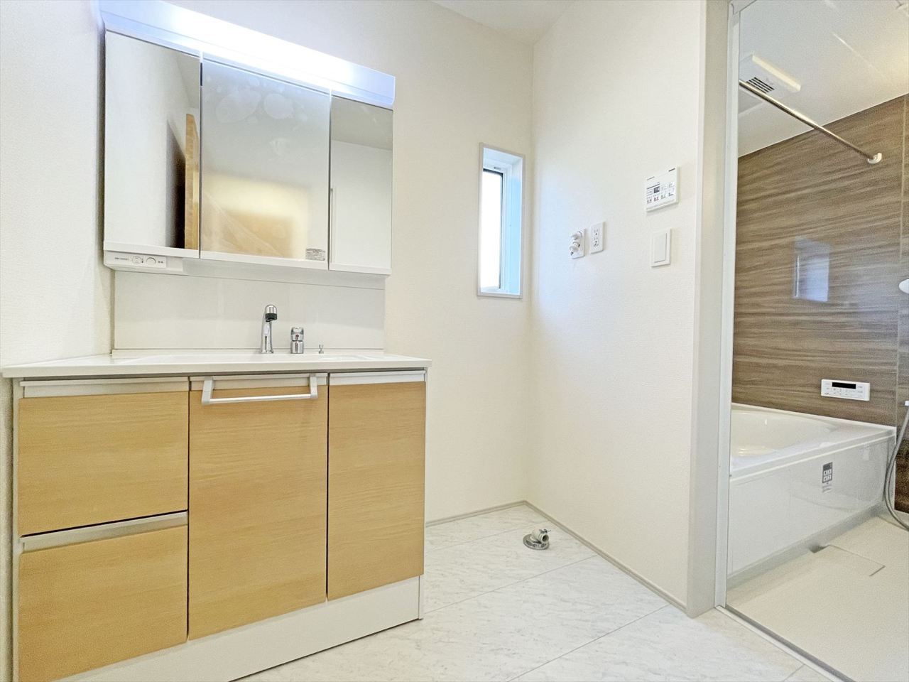 三面鏡にハンドシャワー付き、 使いやすい洗面台。