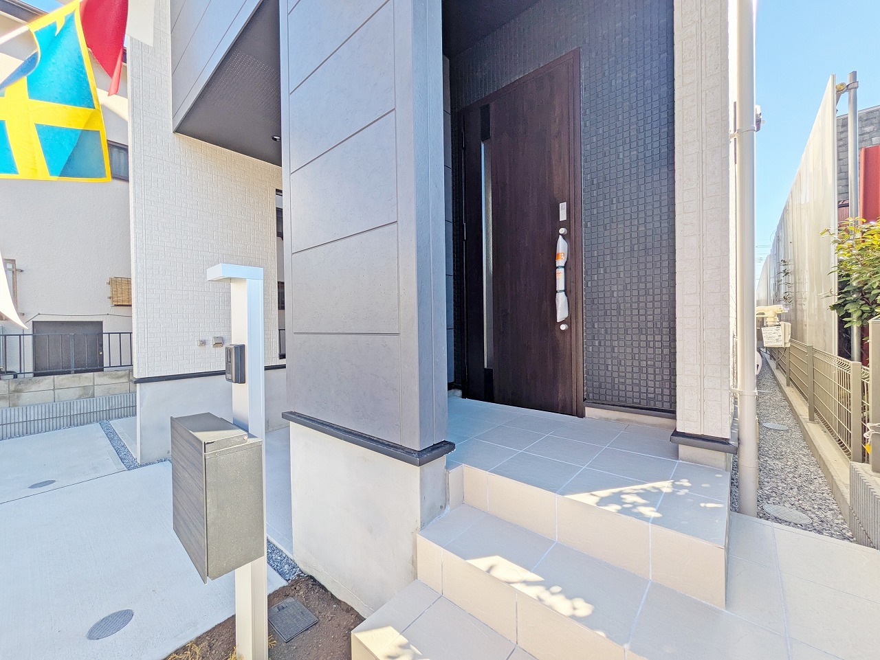ポーチのついた新築分譲物件。玄関の印象はいかがでしょうか?入口からご覧ください。