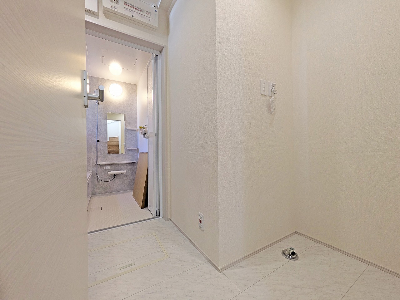 洗面台横にランドリーコーナーもゆったり。ドラム式洗濯機も置けそう。