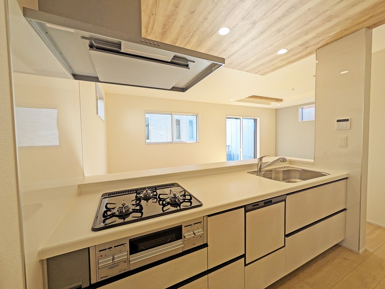 吊戸棚で視界を遮らず、パノラマ感を重視したタイプのキッチンスペース。