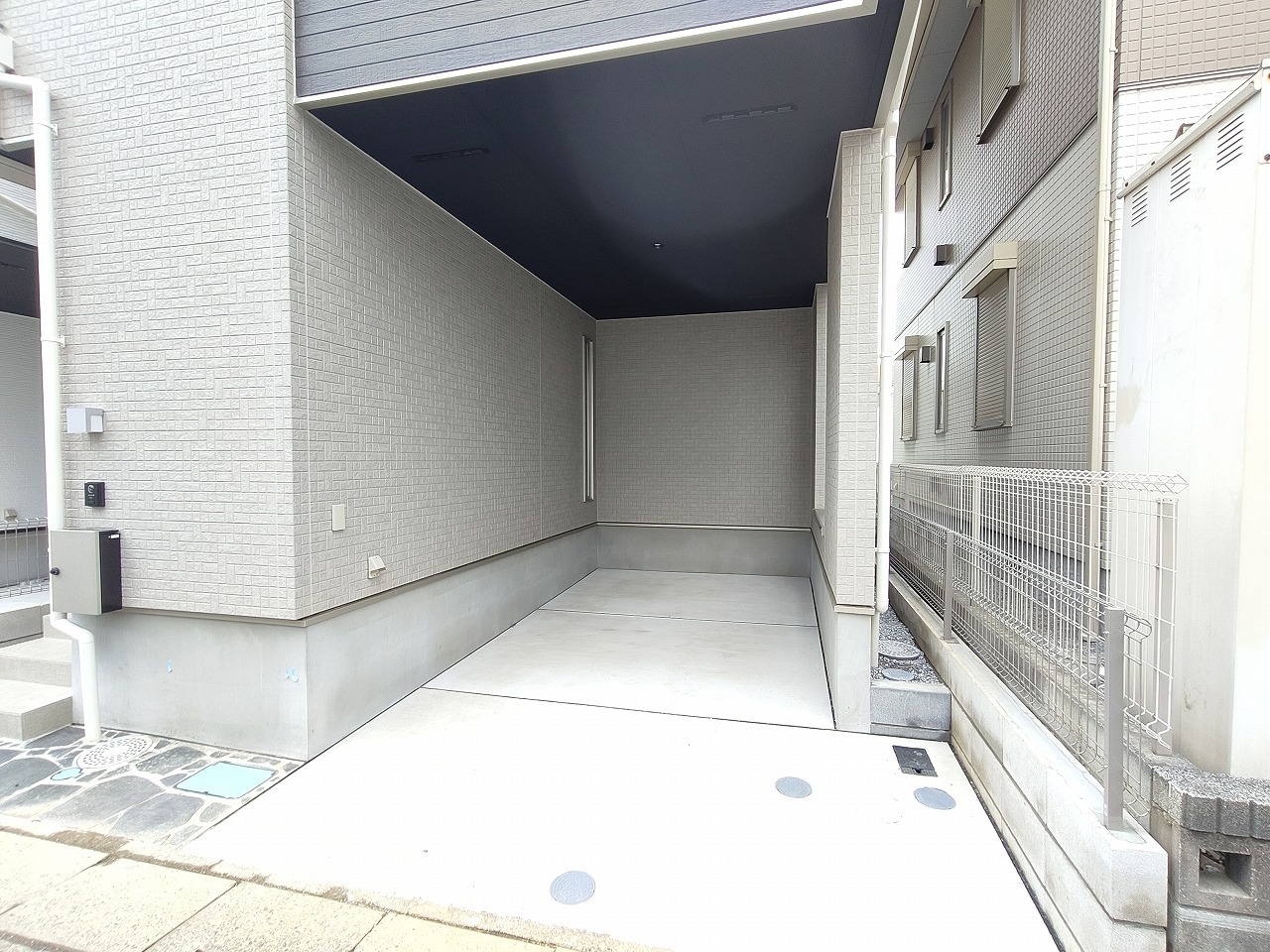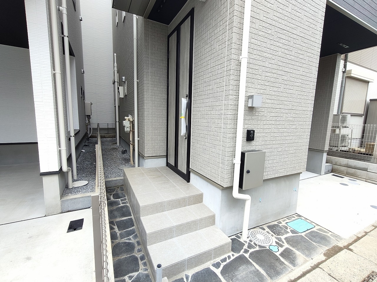 ポーチのついた新築分譲物件。玄関の印象はいかがでしょうか?入口からご覧ください。