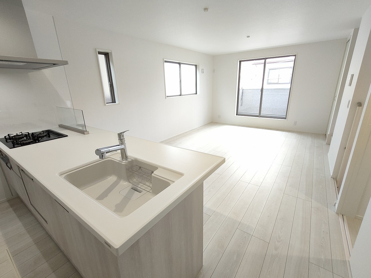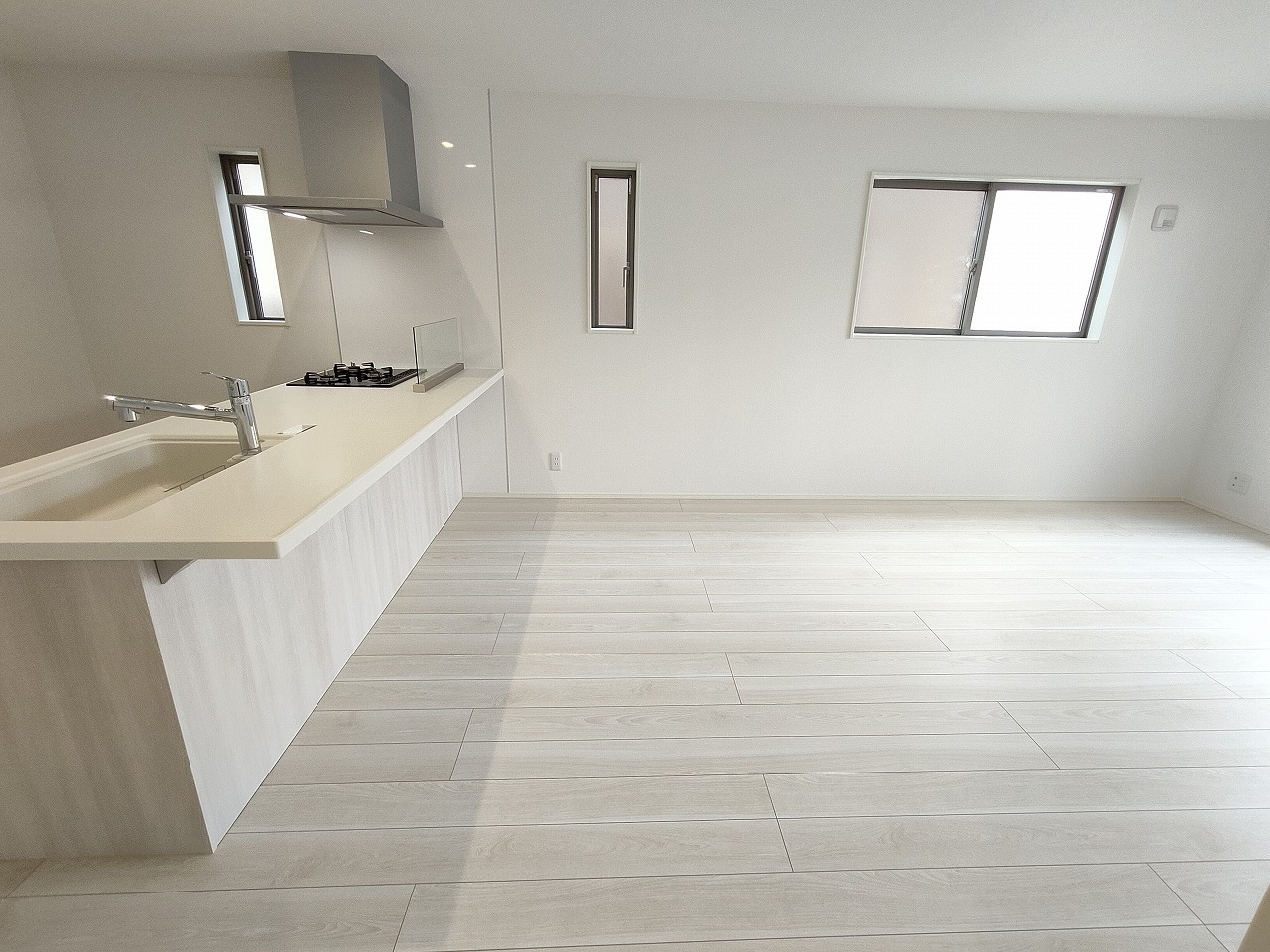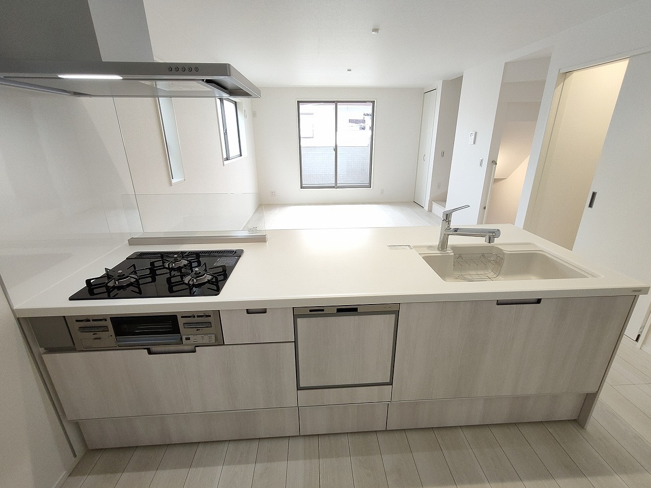 吊戸棚で視界を遮らず、パノラマ感を重視したタイプのキッチンスペース。