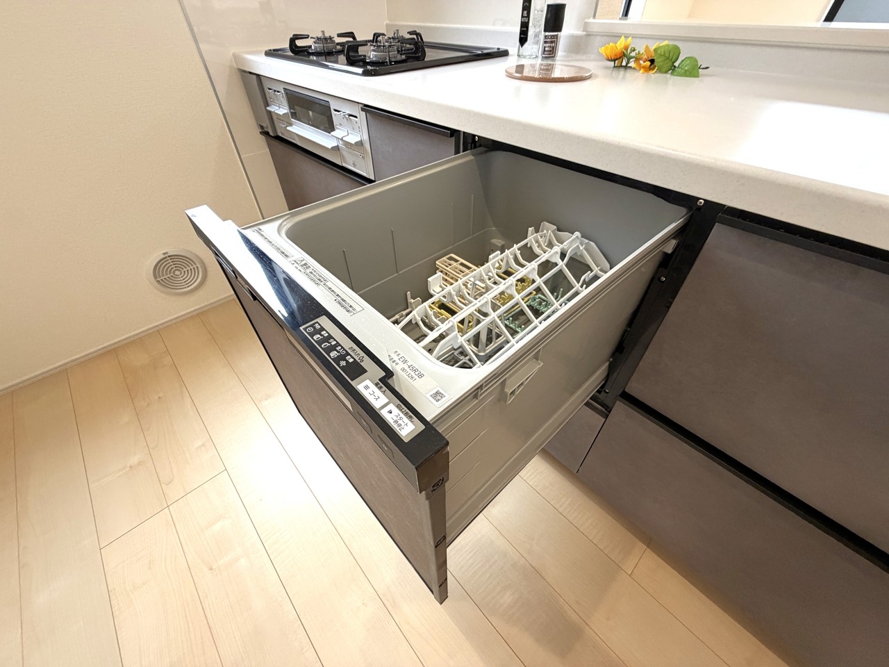 人造大理石トップボードと防汚ウォールで、 お手入れがラクなキッチン。