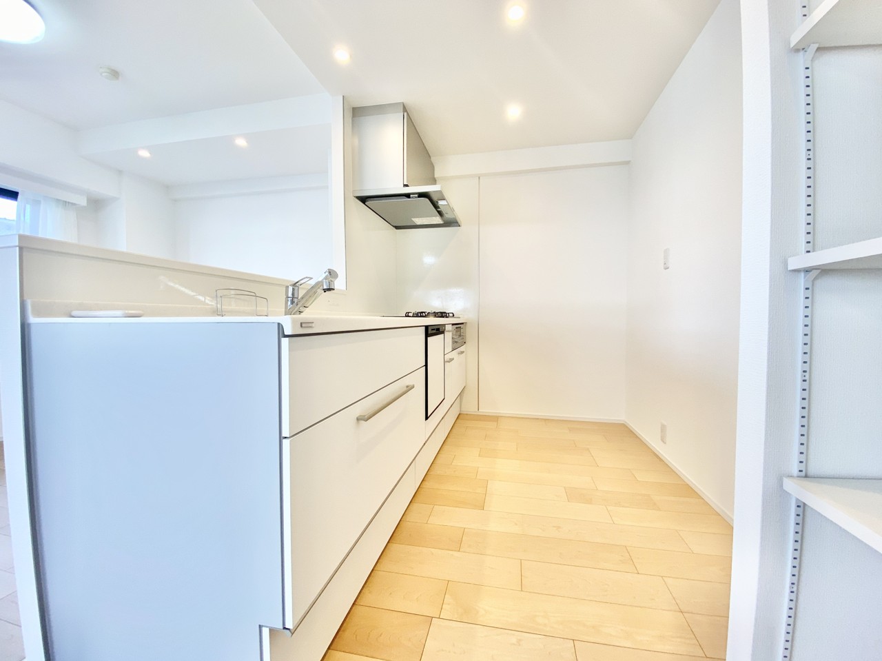 吊戸棚で視界を遮らず、パノラマ感を重視したタイプのキッチンスペース。