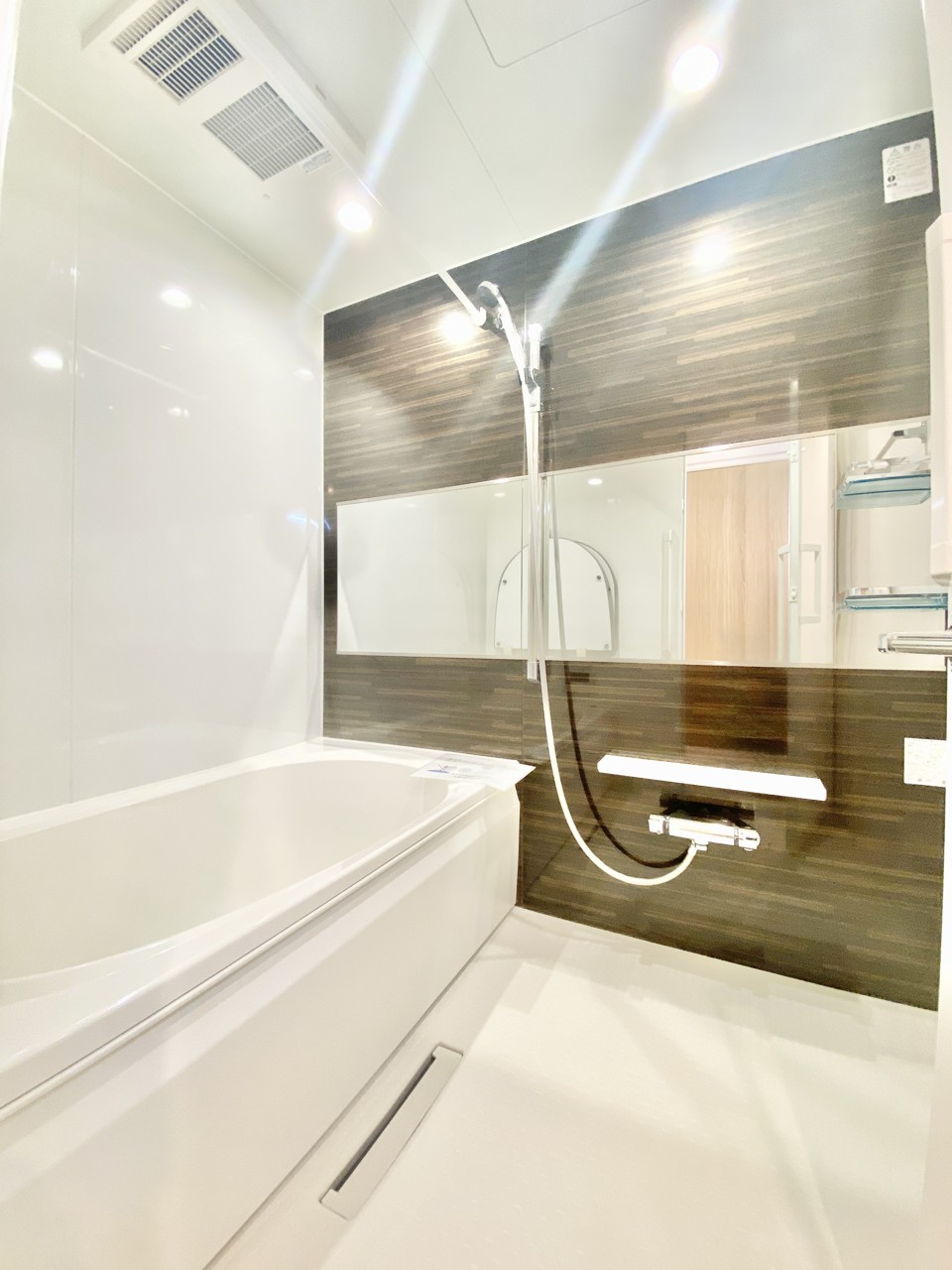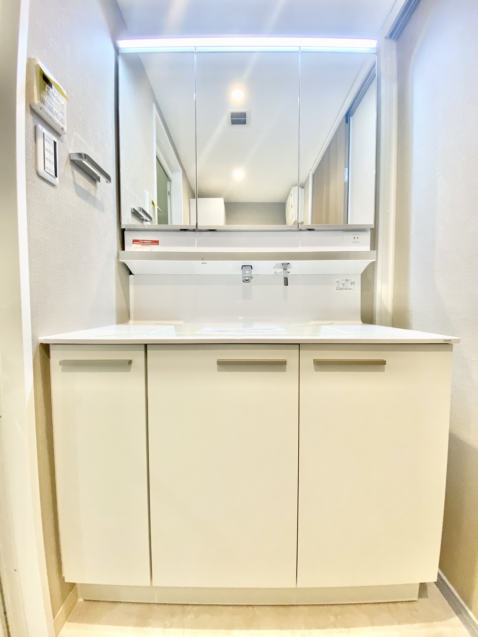 マンションならではの広く、鏡の大きな洗面化粧台。