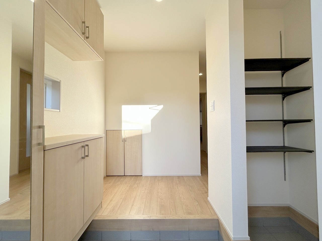誰も住んだことのない家の玄関スペース。あたらしい木のにおいを感じていただけると思います。