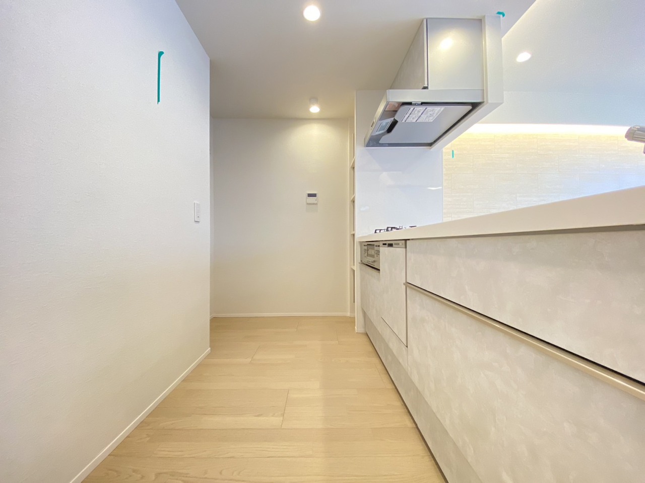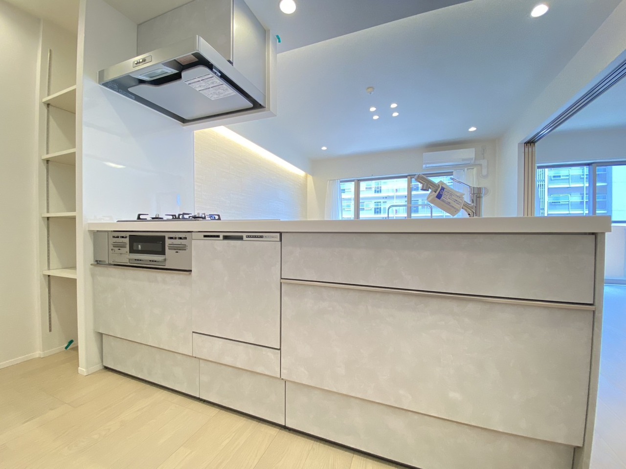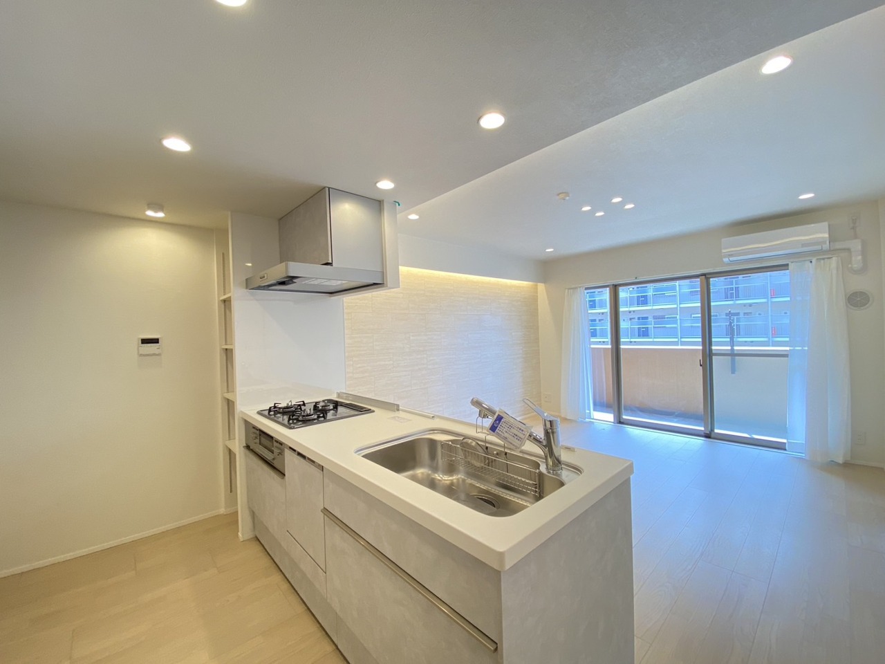 吊戸棚で視界を遮らず、パノラマ感を重視したタイプのキッチンスペース。