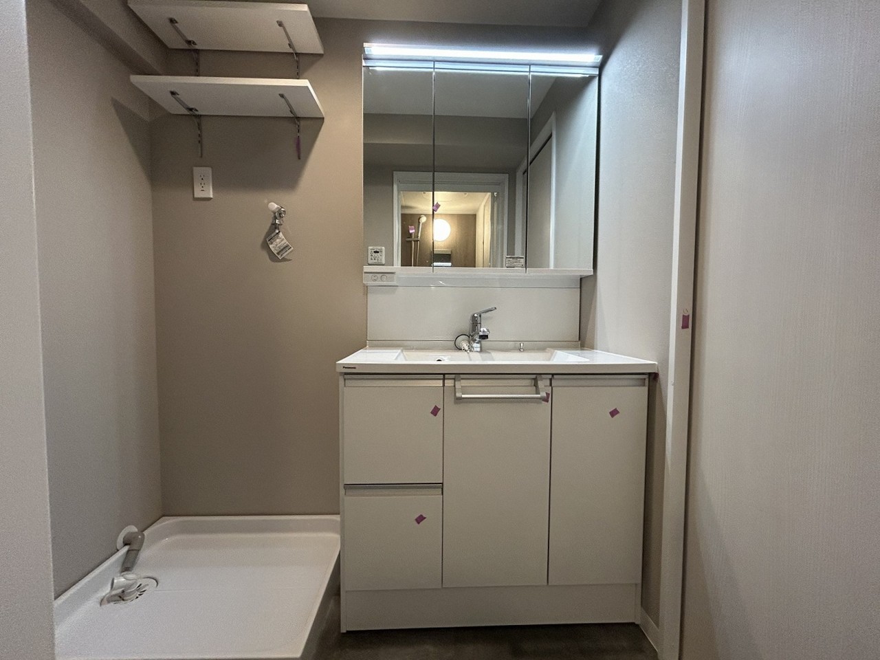 三面鏡を採用した洗面化粧台。鏡の裏にも収納スペースがあります。