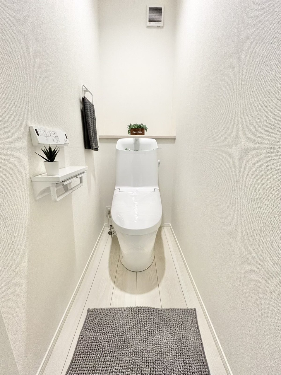 もちろんウォシュレット機能付き。憩いの場としてひそかに注目度の高いお手洗いにもご注目ください。