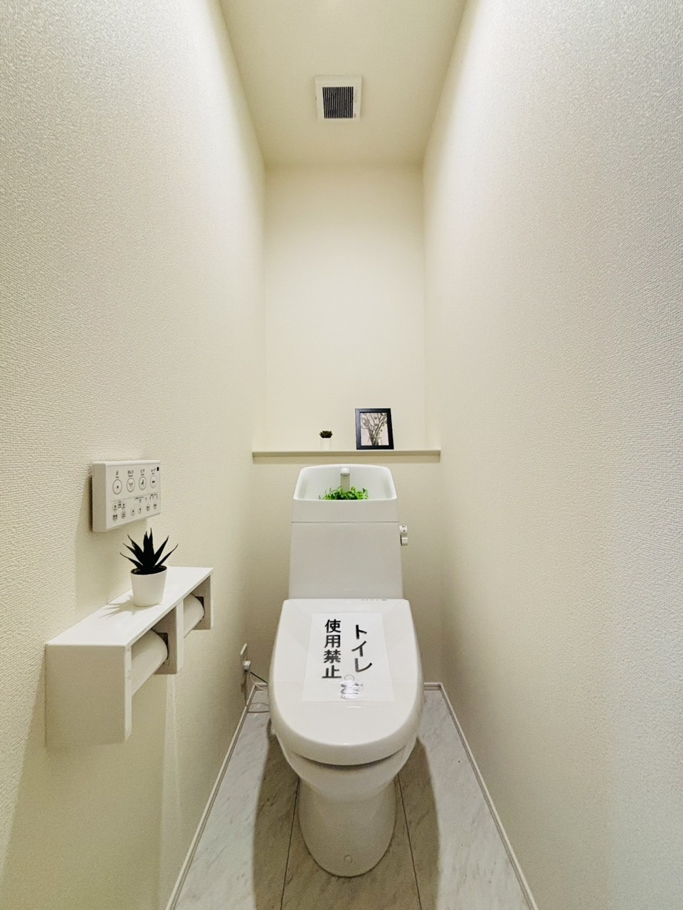 もちろんウォシュレット機能付き。憩いの場としてひそかに注目度の高いお手洗いにもご注目ください。