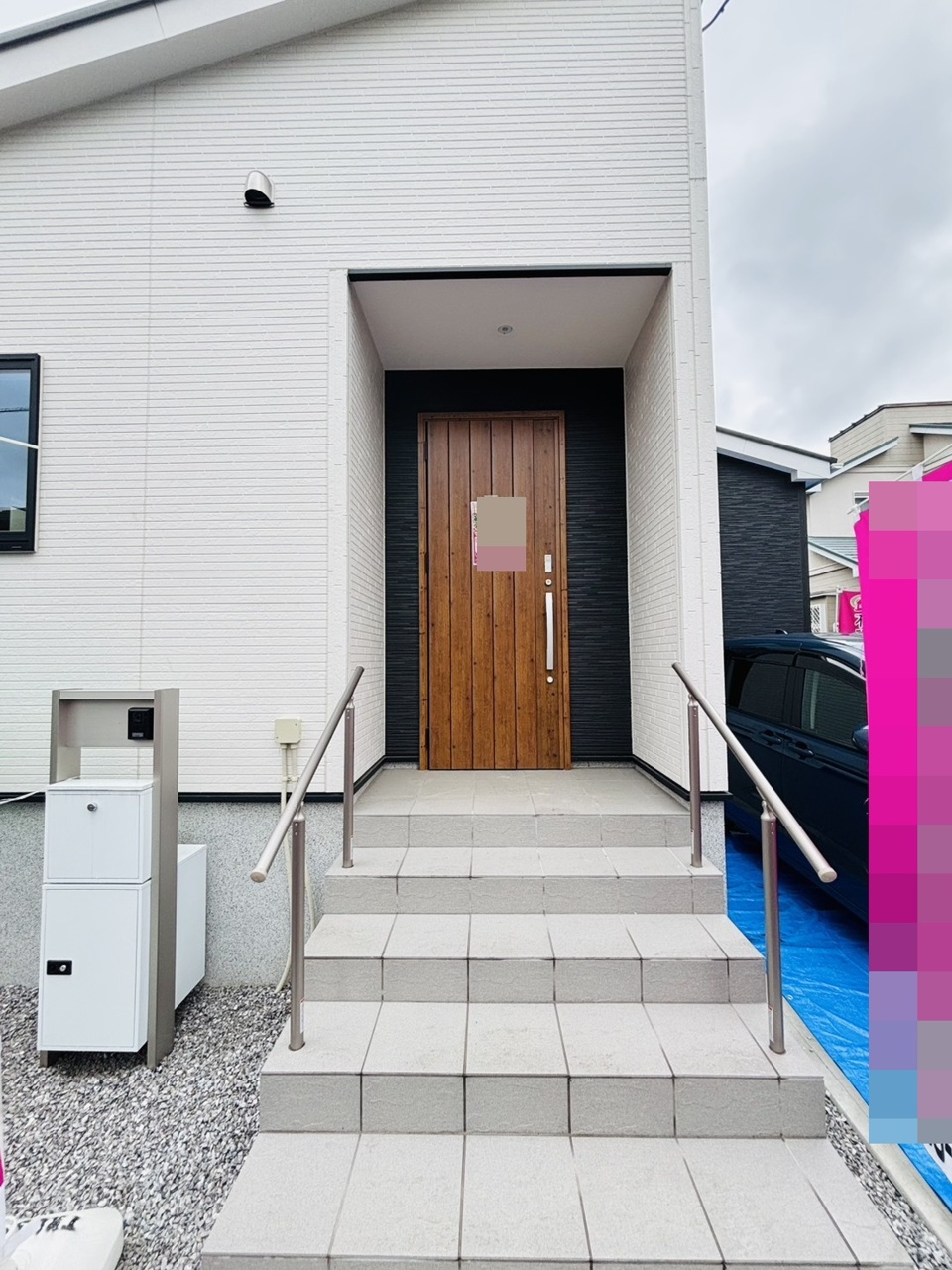 ポーチのついた新築分譲物件。玄関の印象はいかがでしょうか?入口からご覧ください。